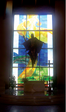 Fijémonos mejor en la figura del “Cristo Resucitado” del fondo del aula litúrgica.