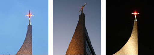 Todo lo dicho está reflejado en esta cruz que en forma de faro está colocada en la cúspide de la iglesia, para el colmo irradiando una luz rojiza (infernal, vaya) desde la rosa.