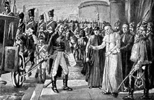 Bajo el encargo de Napoleón, su general Berthier, haciendo ostentación de su poder terreno representado en una espada, toma cautivo al anciano Papa Pío VI en 1798, un año antes de su muerte. Los enemigos de la Iglesia creían haberla vencido por fin. Muy pronto esa convicción se mostró lo que era: una ilusión. Pío VII, también hecho prisionero por Napoleón, volverá triunfalmente a Roma; Napoleón al mismo tiempo irá a morir en su destierro en Santa Elena. Cuando la carroza de Pío VI pasaba por el sur de Francia, la gente esperaba de rodillas en las orillas de los caminos a que el Pontífice les diera su bendición.