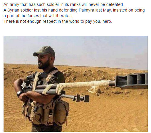 Un soldado sirio que ha perdido una mano hace meses, otra vez en el frente durante la liberación de Palmira.
