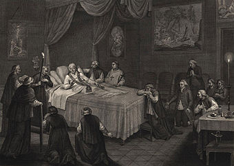 La muerte de Pío VI. Grabado de 1805. Falleció en Valence-sur.Rhône, Francia, el 29 de agosto de 1799. En sus últimas palabras rogó a Dios el perdón para sus carceleros. El clero constitucional negó al cadáver un entierro cristiano; el prefecto de la localidad inscribió en el registro de defunciones: “Falleció el ciudadano Braschi, que ejercía profesión de pontífice”. Muchos periódicos y gacetas de Europa sentenciaron al papado, no al papa, sino al papado, con los titulares: “Pío VI y el último“. En enero de 1800 Napoleón autorizó el permiso necesario para llevar el cuerpo a Roma, y en 1801 los restos fueron trasladados a las grutas vaticanas. Previendo los sucesos con la asistencia divina, Pío VI estableció ya en 1797 que el cónclave posterior a su muerte se celebrara no necesariamente en Roma, sino donde mejor convenga. Fue en Venecia, en el Monasterio de San Giorgio que contaba con la protección de Francisco I de Austria. La Iglesia tuvo al nuevo pontífice, a quien Dios dio un pontificado de los más largos, de 23 años de duración
