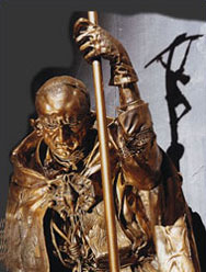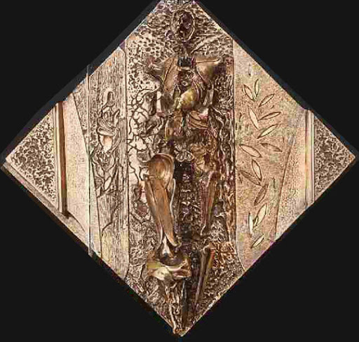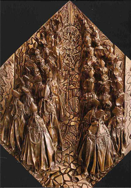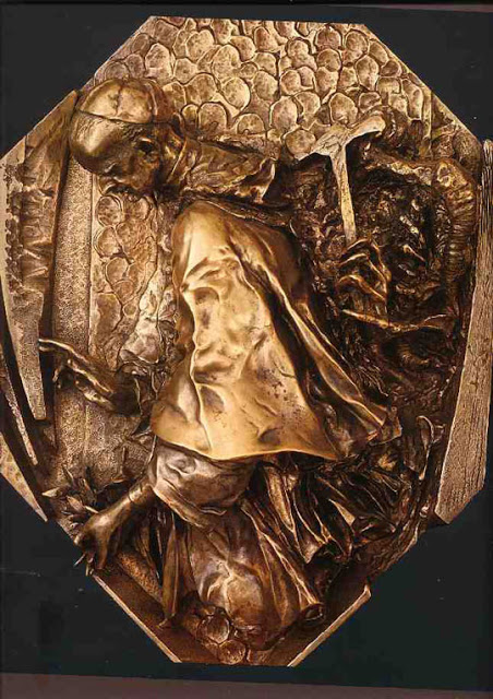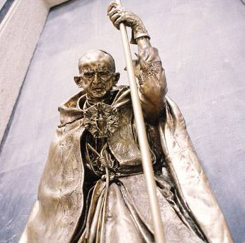 La placa en el centro del pecho de Pablo VI simboliza el efod, que llevaba el gran sacerdote de la Antigua Alianza. Pablo VI lo llevaba en alguna ocasión. Por lo demás, unas imágenes tétricas y desagradables, nada “espirituales” en el sentido tradicional católico. Más bien lo contrario. El artista que elaboró una gran cantidad de estas obras lúgubres es Federico Severino (1953 -), nacido en la misma Brescia. Aquí más reseñas sobres sus obras. Es el mismo autor:
