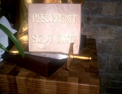 ¿Cristo Resucitado? Algo oscuro, y desagradable, frío y hasta siniestro, sin estudiar siquiera la simbología. Pero tenemos que fijarnos bien. Vamos hacia el altar.