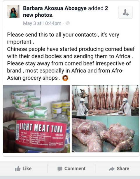 “Por favor, envía esto a todos tus contactos, es muy importante”, publico una mujer, supuestamente de Zambia que vive en Asia. “Los chinos han estado produciendo corned beef (carne procesada y enlatada) con cadáveres y enviándolo a África”, aseguraba.