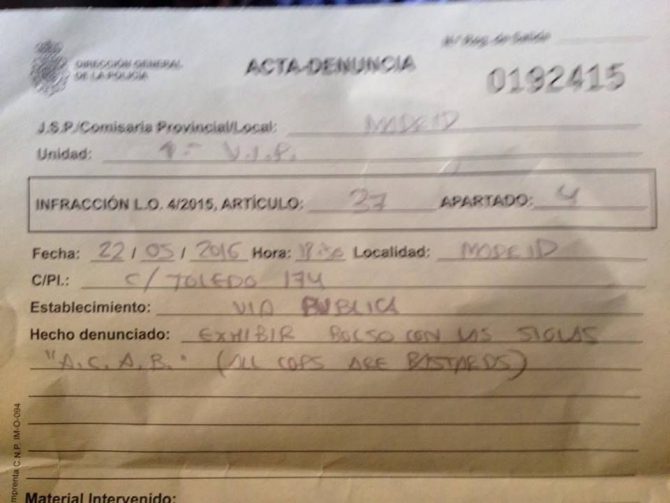 Aunque Lobeto les explicó que las siglas A.C.A.B. solo significaban “All Cats Are Beautiful”, los policías no quisieron retractarse y continuaron la denuncia. La imagen de la sanción ha sido compartida por la directora de arte en Twitter y Facebook, y se ha convertido en un fenómeno viral. Este es el texto que acompaña la publicación: