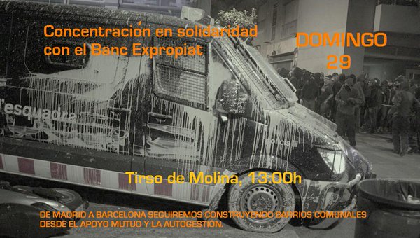 “Piedras, pintadas, martillos y contenedores ardiendo. La dignidad, recuperada a la fuerza y sin pedir permiso, se abre camino estas noches en las calles de la Vila de Gràcia con la resistencia organizada en torno al desalojo del Banco expropiado, en el enésimo intento del estado de derrumbar nuestros sueños. Porque no nos está permitido tener sueños, hacer realidad un nuevo mundo que rompa las cadenas a las que nos ata este viejo mundo en el que sobrevivimos. No nos está permitido portar las ideas de la cabeza y el corazón en las manos.