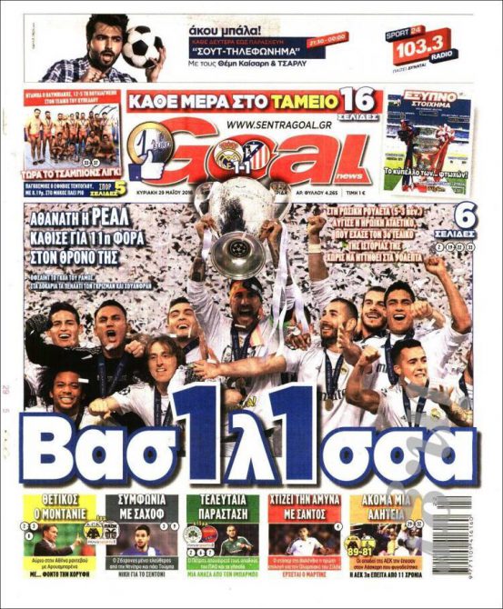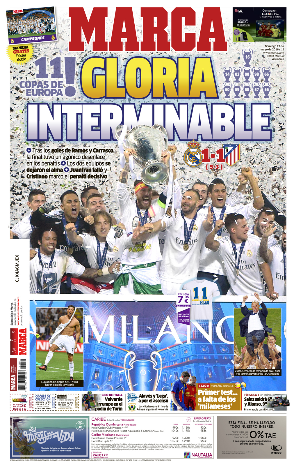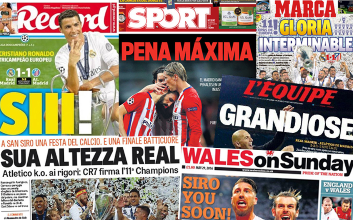 El periódico romano subraya que el Atlético Madrid “cayó como hace dos años” (perdió 4-1 en la prórroga siempre contra el Real en Lisboa) y que el triunfo de los blancos representa la “apoteosis” del entrenador francés Zinedine Zidane y de Cristiano Ronaldo.