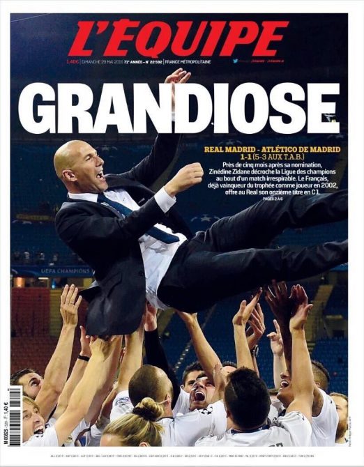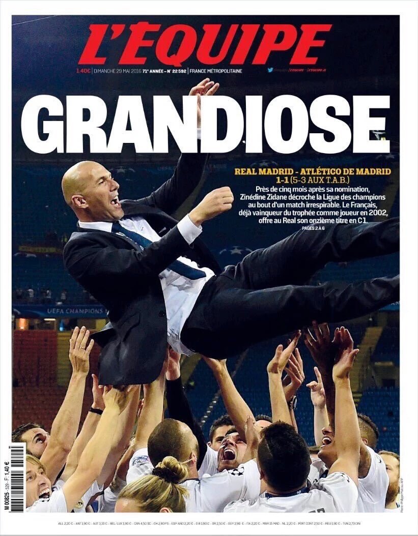 “Grandioso” titula a toda página el diario L’Équipe’ sobre una fotografía de los jugadores blancos manteando a su entrenador tras la victoria en la final de Milán en la tanda de penaltis.