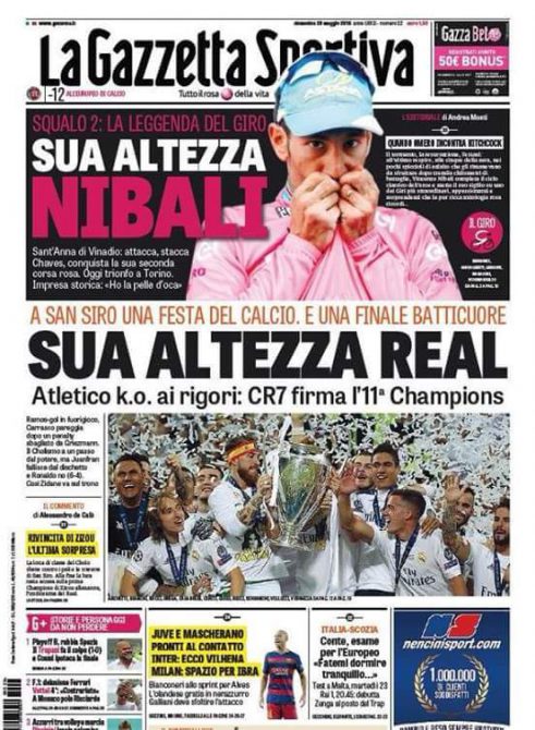 ‘La Gazzetta dello Sport’ sale este domingo con un “Su alteza Real” en la portada, destacando además que la final de la Liga Campeones fue una “fiesta del fútbol”.