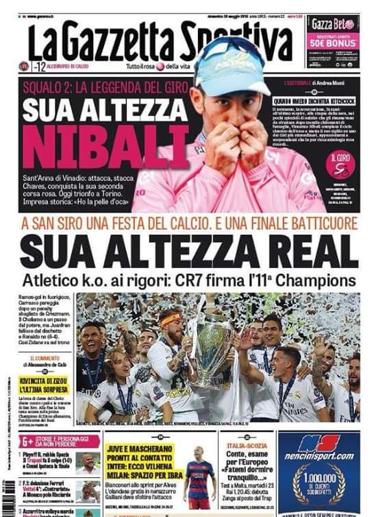 Los periódicos italianos ensalzan en sus portadas el triunfo del Madrid, definido como “su alteza Real”.