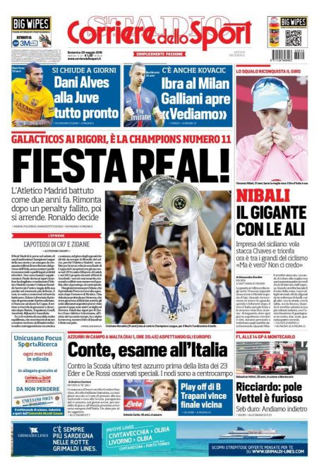 El ‘Corriere dello Sport’ apostó por “fiesta Real” en su portada, con una gran foto de Ronaldo levantando la “orejona”.