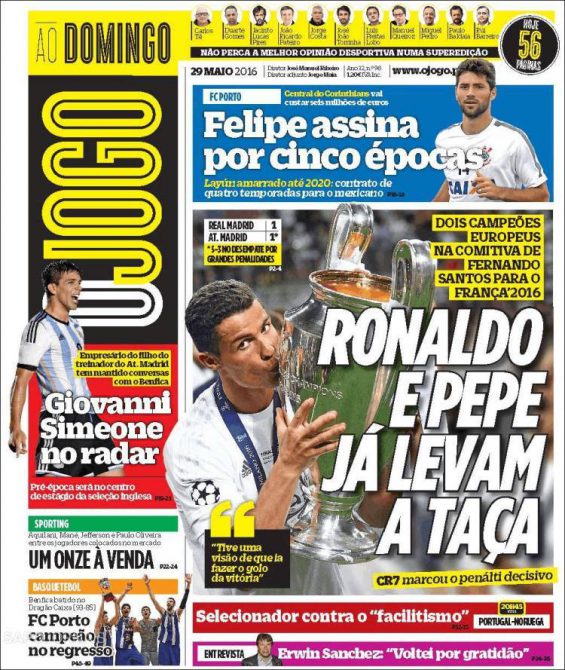 “Con botas de oro” o “Síii” (grito de guerra de Ronaldo) fueron los titulares del diario ‘A Bola’ y ‘Record’, respectivamente, mientras que “O Jogo” optó por un titular también incluyendo al otro portugués del Real Madrid, Pepe (“Ronaldo y Pepe ya levantan la Copa de Europa”).