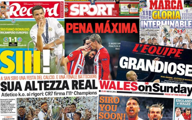 ‘The Independent’ dice que “el Real Madrid reina supremo después de que el disparo de Ronaldo asegure la victoria en los penaltis” y “The Sun” destaca que el equipo blancos festejó la victoria toda la noche antes de pasear hoy su undécimo trofeo europeo por las calles de la capital española.