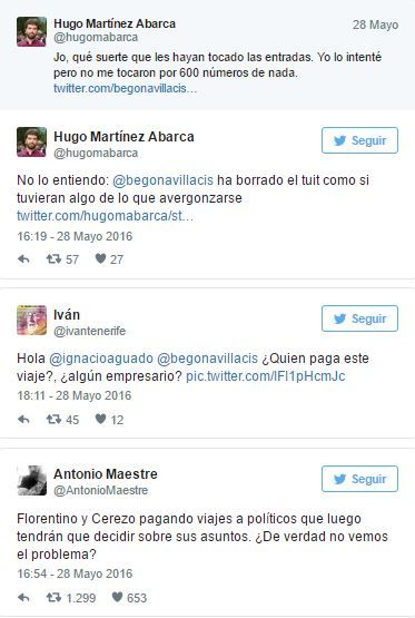 Tan pronto se publicó, aparecieron las primeras quejas. Tanto de ciudadanos anónimos, que le felicitaban con sorna por lo afortunada que había sido al lograr una entrada al tiempo que cuestionaban la ética de la política al aceptar el regalo de un empresario con grandes intereses en Madrid y sobre los cuáles tendrá que votar Villacís en el Pleno municipal. Sin ir más lejos la recalificación de los terrenos del Vicente Calderón y el número de alturas permitidas en reconstrucción.