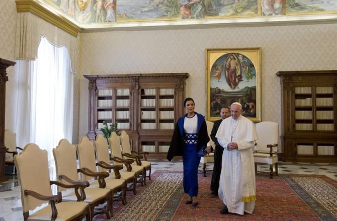 Durante el encuentro, según los medios locales, Francisco recordó a la jequesa que “cristianos y musulmanes tienen la misma raíz”.