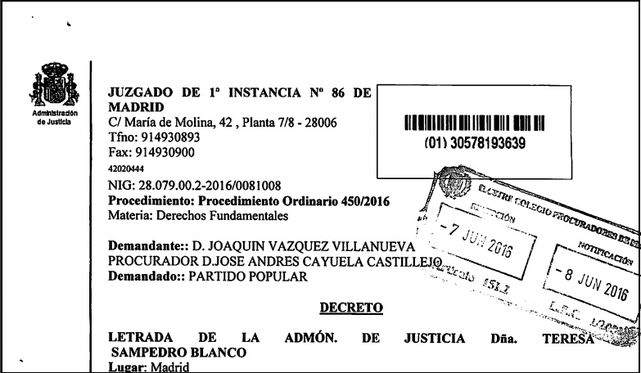 El titular del Juzgado de Primera Instancia número 86 de Madrid, al que se le asignó el caso hace menos de dos semanas, ha admitido la demanda al entender que tiene sustento jurídico y que se están pudiendo vulnerar derechos fundamentales de la militancia del PP.