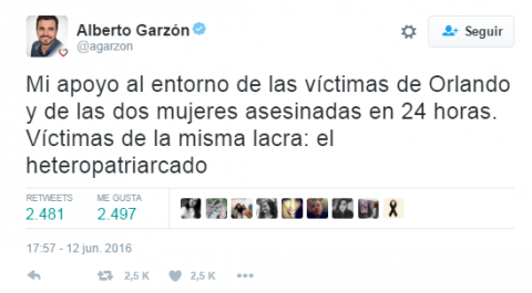 Lejos de señalar y condenar a los autores de la masacre con el mismo énfasis que lo hubiera hecho de haberlos podido vincular con alguna organización cristiana cercana a Donald Trump, el líder de IU, Alberto Garzón, ha acusado este domingo al “heteropatriarcado” del ataque islamista. “Mi apoyo al entorno de las víctimas de Orlando y de las dos mujeres asesinadas en 24 horas. Víctimas de la misma lacra: el heteropatriarcado”, ha dicho.