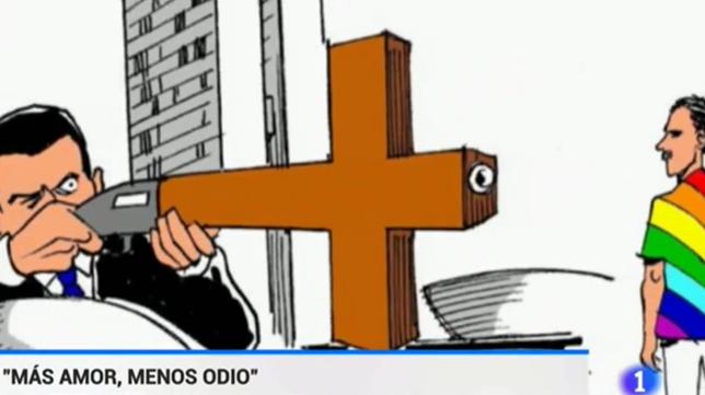TVE ha pedido disculpas por emitir, al cierre del nocturno Telediario de este domingo, un dibujo tomado de las redes sociales que representa a un hombre que apunta a un homosexual con una escopeta con forma de cruz de madera.