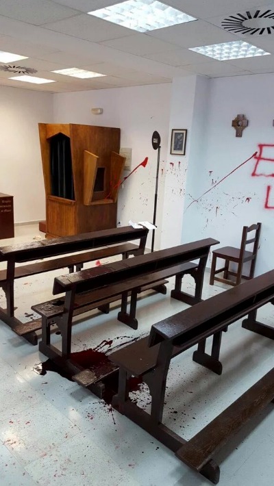 El capellán ha informado que, además de las paredes, los asaltantes han llenado de pintura el altar, el sagrario, el confesionario y los bancos de la capilla. Al salir de la capilla dejaron unos panfletos con mensajes reivindicativos, pero se desconoce todavía quienes son los responsables del ataque.