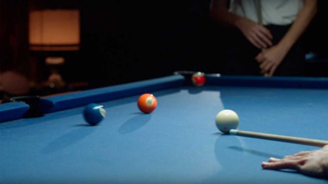 La pieza vuelve a recrear una partida de billar americano en la que el jugador impacta en la bola naranja- lisa pretendiendo hacer una carambola para meter la azul, también lisa; pero la naranja no se comporta como él espera y, hace un extraño quiebro y acaba metiendo en la tronera la bola roja rayada.