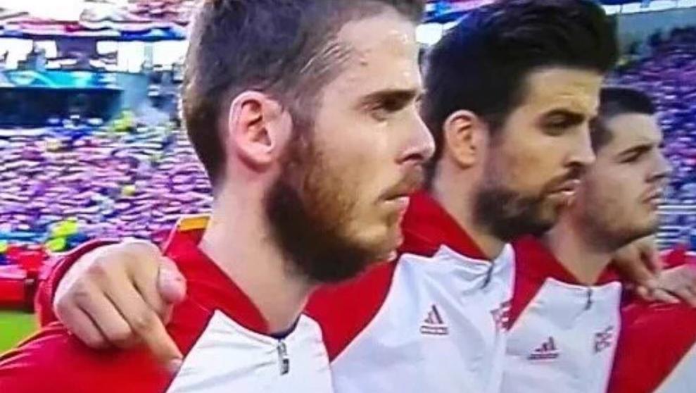 Poco antes de comenzar el encuentro en el que se enfrentaban Croacia y España, con los dos equipos alineados en el terreno de juego y mientras sonaba el himno español, la cámara hacía un barrido por las caras de los jugadores nacionales y capturaba la mano de Piqué en lo que pareció una «peineta».