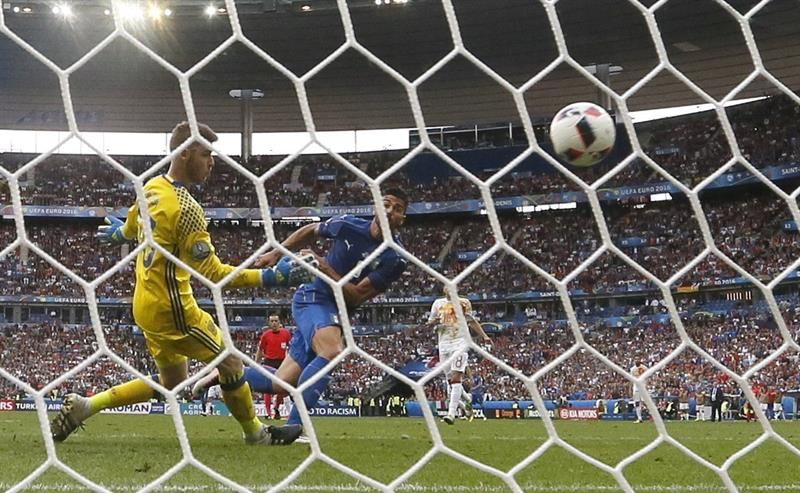 El portero español David de Gea (i) encaja el gol marcado por el delantero de la selección italiana Graziano Pellè (d), el segundo del equipo ante la selección española, durante el partido Italia-España de octavos de final de la Eurocopa de Fútbol de Francia 2016, que se jugó en el Estadio de Saint Denis de París.