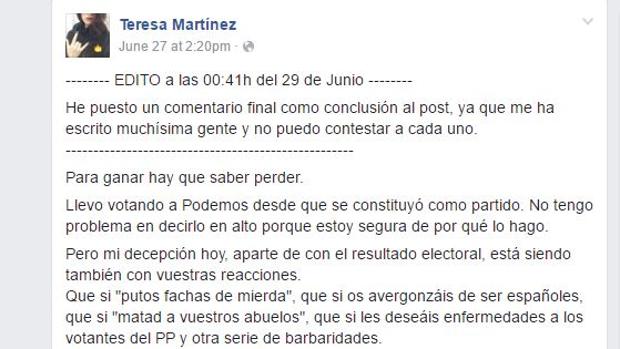 Teresa Martínez decidió escribir en su perfil de Facebook el pasado lunes 27, tras conocerse los resultados de las elecciones del domingo. Un mensaje dirigido a su partido, Podemos, al que reconoce votar desde su constitución, y a otros votantes del mismo tras leer y escuchar reacciones en contra de la victoria del PP.