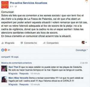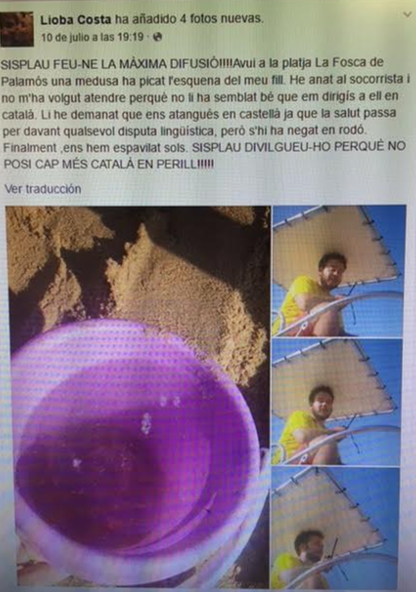 “SISPLAU FEU-NE LA MÀXIMA DIFUSIÓ!!!!Avui a la platja La Fosca de Palamós una medusa ha picat l’esquena del meu fill. He anat al socorrista i no m’ha volgut atendre perquè no li ha semblat bé que em dirigís a ell en català. Li he demanat que ens atangués en castellà ja que la salut passa per davant qualsevol disputa lingüística, però s’hi ha negat en rodó. Finalment, ens hem espavilat sols. SISPLAU DIVILGUEU-HO PERQUÈ NO POSI CAP MÉS CATALÀ EN PERILL!!!!!”