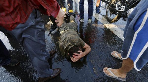 Algunos de los soldados golpistas son subidos bruscamente a un transporte luego de ser arrestados por policías y civiles leales