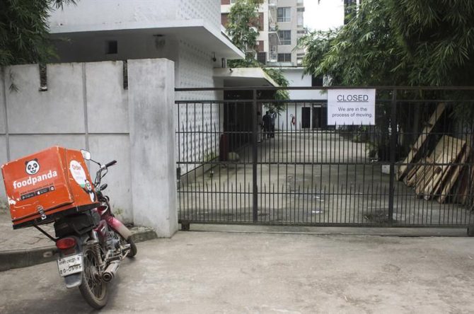 Imagen tomada el 29 de julio de un restaurante frecuentado por extranjeros de la capital de Bangladesh cerrado mientras cambia su ubicación.