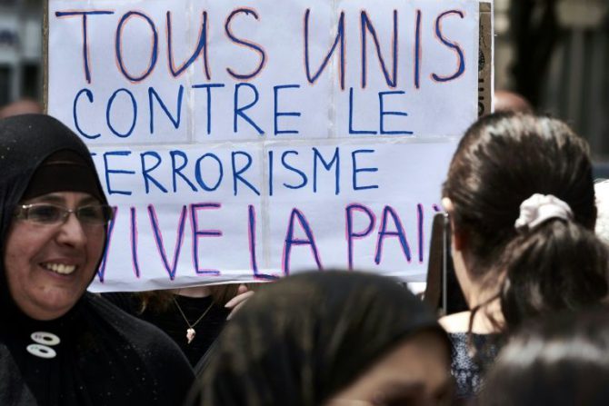 Personas marchan con una pancarta con la consigna “Todos unidos contra el terrorismo, viva la paz”, el 30 de julio de 2016, en Lyon (Francia)