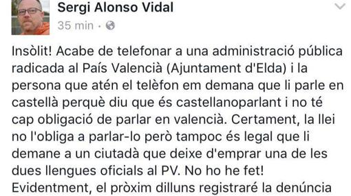 «¡Insólito! Acabo de llamar a una administración pública radicada en el País Valenciano (Ayuntamiento de Elda) y la persona que atiende el teléfono me pide que le hable en castellano porque dice que es castellanohablante y no tiene obligación de hablar en valenciano», relata Alonso en su página de Facebook.