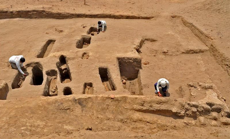 Arqueólogos peruanos hallaron un agrupamiento de más de trece entierros prehispánicos alrededor de las ruinas de un templo de la época situado en la costa norte de Perú, entre ellos las tumbas de dos niños sin pies, posiblemente sacrificados como ofrenda al complejo ceremonial, informaron hoy sus investigadores.