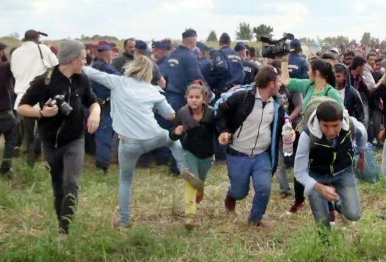 Captura de pantalla de un vídeo que muestra a la periodista húngara Petra Laszlo (de azul) haciendo una zancadilla a una niña en unos enfrentamientos en Röszke, en el sur de Hungría, el 9 de septiembre de 2015