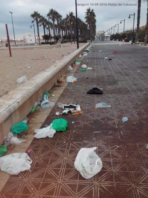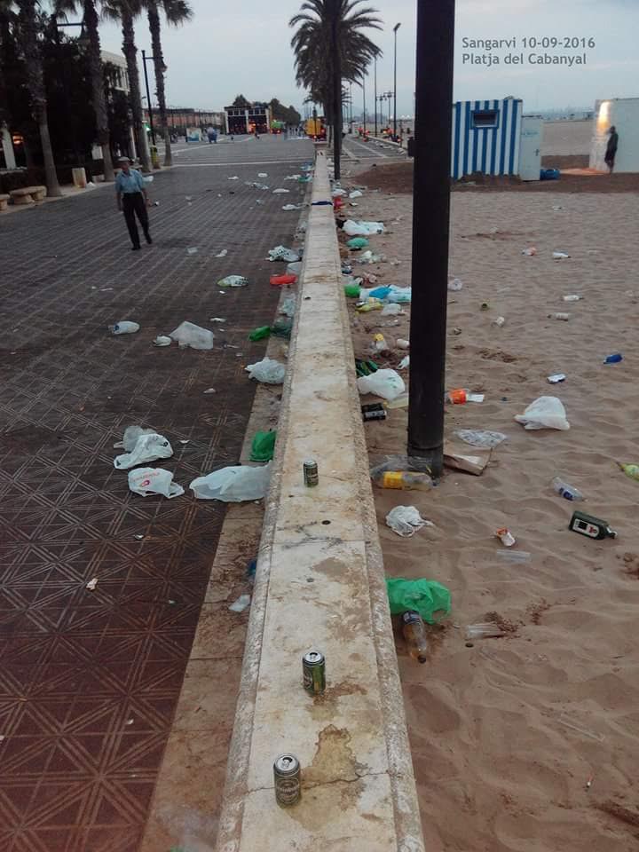 La ciudad de Valencia, está siendo democráticamente comida por la mierda, y como creo que una imagen vale más que mil palabras, vean ustedes como amanecía la emblemática playa de la Malvarrosa durante el pasado fin de semana. Fíjense en las fotografías y podrán comprobar, no solo los desperdicios en forma de papeles, envases, cartones, plásticos, etc., que como dije en el artículo anterior nadie barre ni recoge, sino también las botellas de vidrio rotas a lo largo del largo paseo y sobre la arena, donde cientos de niños corren descalzos ajenos al peligro.