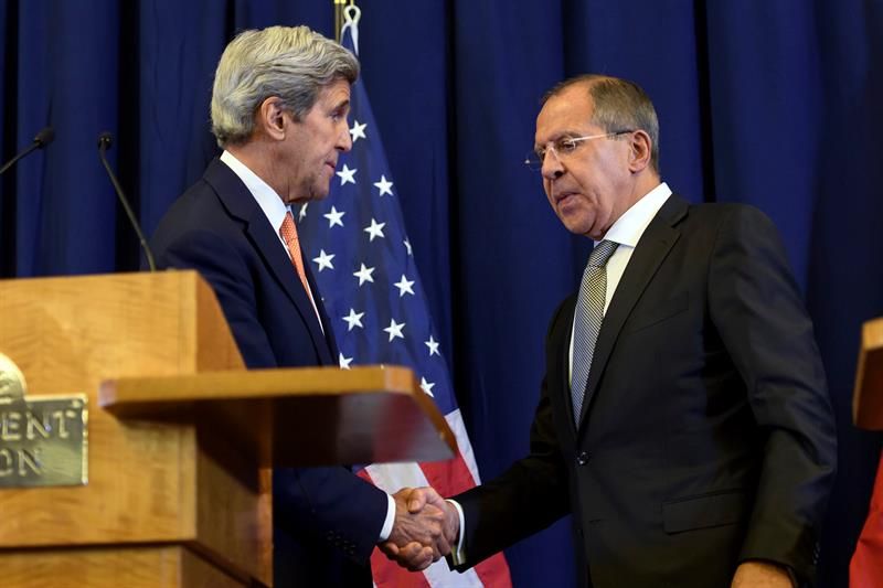 El secretario de Estado de EEUU, John Kerry (i), saluda al ministro ruso de Asuntos Exteriores, Sergei Lavrov (d), el pasado 9 de septiembre en Ginebra, Suiza.