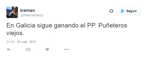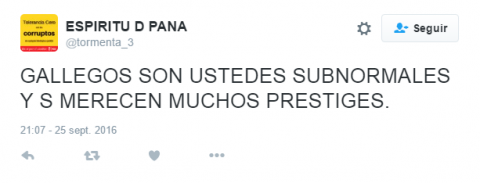 Las hordas podemitas, que como sus dirigentes no aceptan la discrepancia política e ideológica, han vuelto a arremeter -ya lo hicieron el pasado 26 de junio tras las elecciones generales- contra los votantes gallegos del PP, especialmente los mayores. Algunos les han tildado de “cómplices de mierda”, “aldeanos”, “paletos”, “putos gallegos”, “subnormales”, “narcotraficantes” e incluso un usuario ha asegurado que “merecen muchos Prestiges”, haciendo referencia al desastre mediambiental que asoló las costas gallegas en 2002.