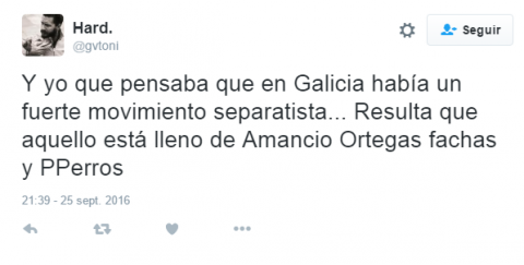 A uno de estos perros le gustaría que Galicia estuviera lleno de separatistas y no de Amancios Ortegas, jodete que tendras que trabajar, la subvención por no hacer nada no te va a caer indefinidamente.