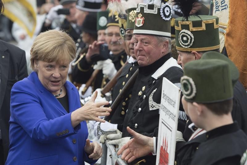 La canciller alemana, Angela Merkel (i), saluda a su llegada a la plaza de Neumarkt durante las celebraciones por los 26 años de la reunificación de Alemania, en Dresde, Alemania, hoy, 3 de octubre de 2016.
