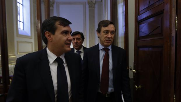 El portavoz del PP en el Congreso, Rafael Hernando, en segundo plano a la derecha tras el secretario de Estado de Relaciones con las Cortes, José Luis Ayllón