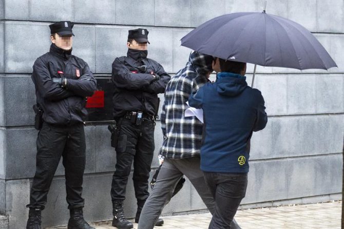 Coincidiendo con la comparecencia de los detenidos ante el juez, un grupo de unas veinte personas se ha concentrado ante el Palacio de Justicia con carteles en los que se podía leer: “No a los montajes policiales”.