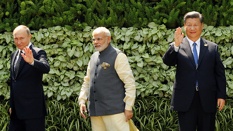 El presidente ruso. Vladímir Putin, el primer ministro indio, Narendra Modi, y el líder chino, Xi Jinping