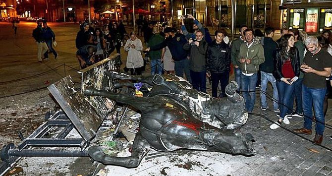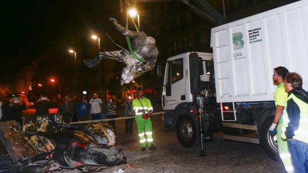 En un acto vandálico a la estatua derribada se le había sustraido con anterioridad la cabeza durante su custodia en un almacén municipal, tras ser exhibida durante décadas en el patio de armas del castillo de Montjuïc.