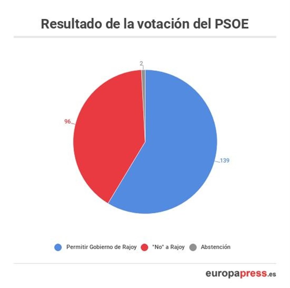 El Comité Federal del PSOE ha decidido hoy abstenerse en una investidura de Rajoy por 139 votos a favor y 96 en contra, gesto que abre la puerta a que después de más de 300 días de gobierno en funciones, el líder del PP pueda formar un nuevo Ejecutivo una vez logre la confianza de la Cámara Baja a finales de la próxima semana. Queda pendiente por decidir si esa abstención será en bloque o con los votos necesarios para facilitar la investidura puesto que hoy sólo se dirimía si el partido mantenía su «no» a Rajoy o se cambiaba el sentido del voto para evitar unas terceras elecciones.