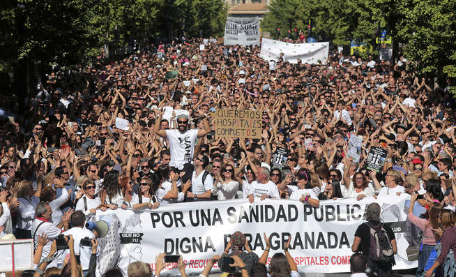EC.- Quien conoce Granada sabe que es una ciudad tranquila. Que por debajo de los estudiantes y los turistas no hay una masa social peleona sino más bien conservadora. Sin embargo, el domingo pasado una auténtica marea blanca tomó la ciudad. Fue una manifestación brutal. Entre 40.000 y 80.000 personas (en una ciudad de 250.000). La Gran Vía, una de las principales arterias de la ciudad, y los accesos estaban a reventar, como muestra este vídeo casero. Protestaban por la fusión de los hospitales que la Junta de Andalucía llevó a cabo en julio pasado y que ha levantado a médicos, pacientes, la oposición como nadie lo había hecho antes. Los capitaneaba en plan estrella del rock un médico con bata blanca, gafas de sol y gorra hacia atrás, una especie de Juan Luis Guerra andaluz que se hace llamar Spiriman. ¿Qué está pasando? ¿Se resquebraja la imagen de los servicios públicos en Andalucía? ¿Era solo un mito hábilmente construido por el PSOE y por Susana Díaz? ¿Quién es este médico? La historia es simple y a la vez compleja.