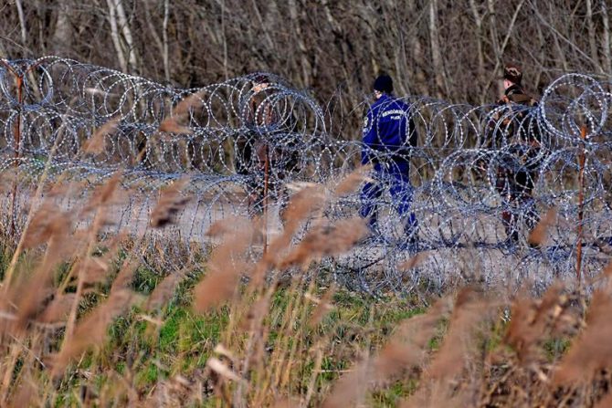 Policías y soldados húngaros patrullan junto a la valla temporal que separa la frontera entre Serbia y Hungría, en Hajdukovo, Serbia.