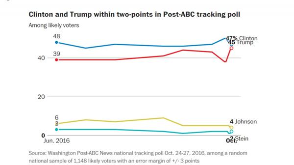 Una encuesta publicada por The Washington Post en conjunto con ABC News Tracking indica un descenso abrupto de la candidata demócrata Hillary Clinton en la intención de voto con respecto al republicano Donald Trump. La encuesta fue realizada antes de que se conociera la nueva investigación del FBI a la candidata demócrata.