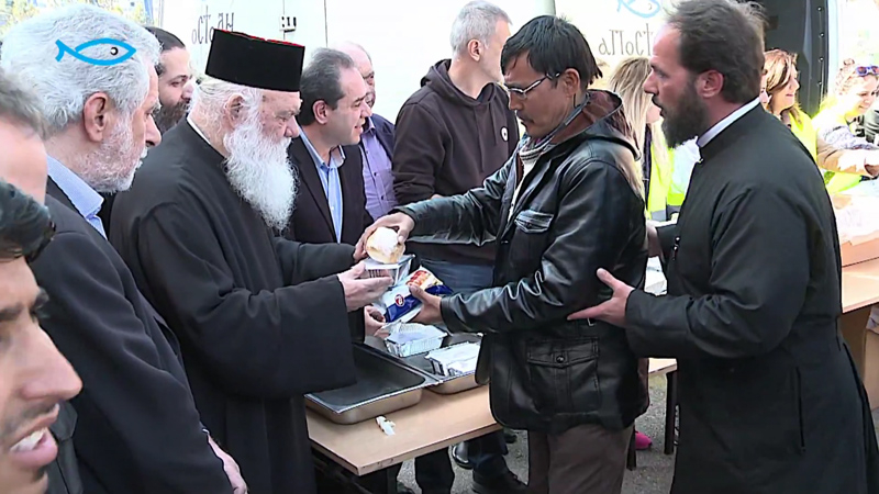 El arzobispo Jerónimo de Atenas y toda Grecia distribuye comida a migrantes en el puerto del Pireo. El arzobispo se quitó el crucifijo durante su visita al Pireo, para, dijo, no “ofender” a los migrantes musulmanes. (Imagen: pantallazo de un vídeo de Hellas News TV)