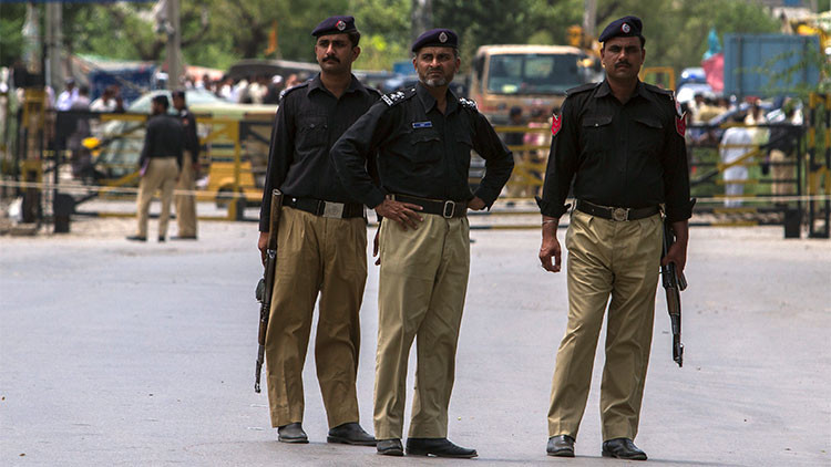 Policías paquistaníes hacen guardia cerca del lugar de un atentado contra un vehículo de las fuerzas de seguridad en la ciudad Fateh Jang, Pakistán