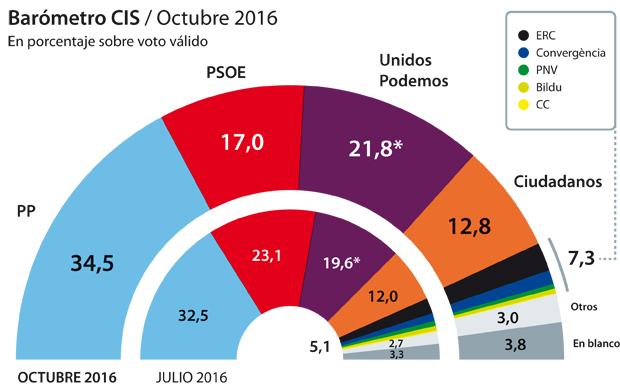 El Partido Popular volvería a ganar otras elecciones generales, con más votos que en junio, un 34,5 por ciento, pero además doblaría a un PSOE hundido, que cae hasta el 17 por ciento, casi seis puntos menos que en las últimas generales. Unidos Podemos y sus marcas territoriales se consolidarían como segunda fuerza política, con un 21,8 por ciento, mientras que Ciudadano se mantiene cuatro, con un 12,8 por ciento, según el barómetro de octubre del CIS, que se realizó justo después del tormentoso Comité Federal del PSOE.